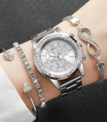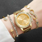 4-piece women’s rhinestone quartz watch set with stainless steel band and matching bracelets. Elegant fashion accessories for ladies.