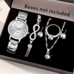 6-piece women’s quartz watch set featuring simple dial wristwatch and rhinestone-accented jewelry. Elegant fashion accessories for ladies.