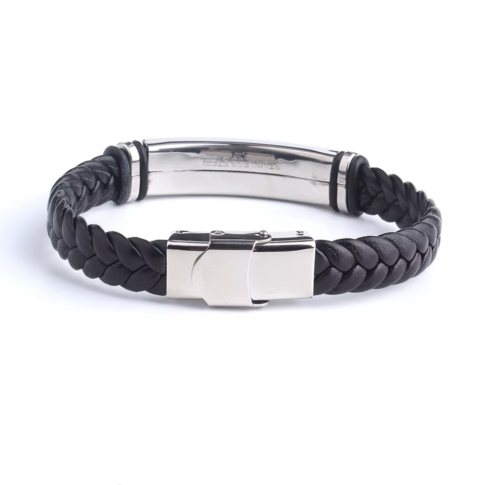 This bracelet combines a durable leather band with a stainless steel ID plate, allowing you to engrave a name, logo, or meaningful text.