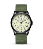 Men’s military quartz watch with nylon strap, luminous analog dial, date display, and 30M water resistance for everyday wear.