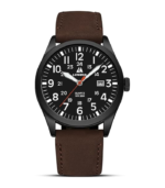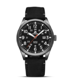The analog dial includes 12 and 24 hour military time with luminous hands and markers for visibility in low light conditions. A date calendar is included for convenience.